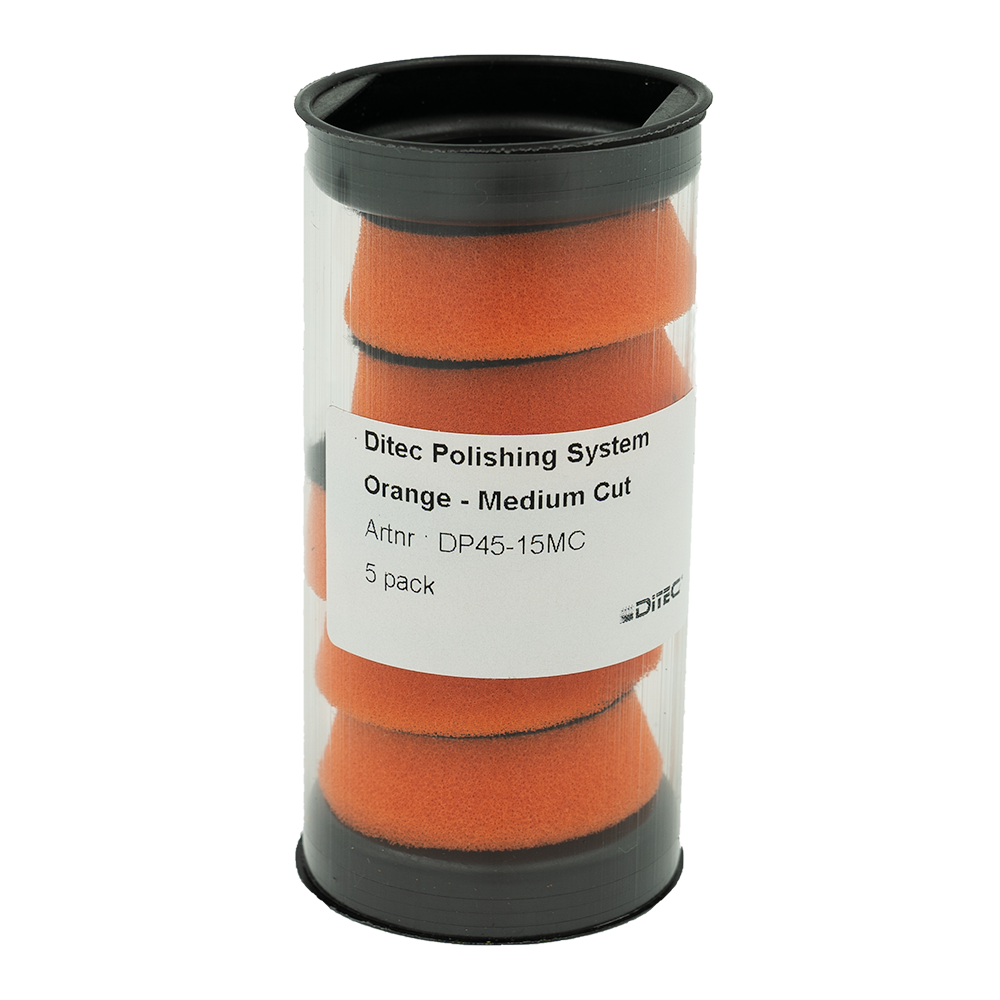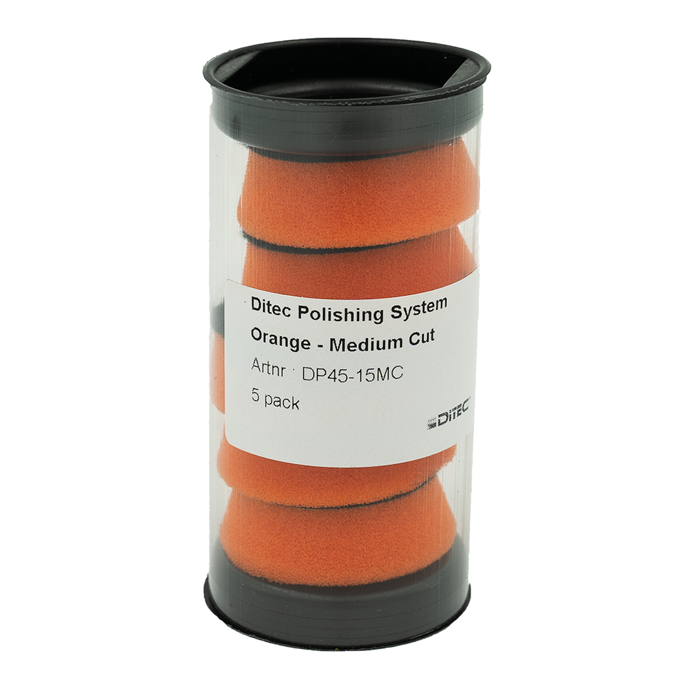 NEW! Ditec foam polishing pads 2.0 Our new, premium quality foam pads, tested and manufactured for use with our range of high performance polishing products. The orange coloured pad is made for medium cutting/ high gloss effect. Suitable for both finishing and moderate cut correction of all modern paint types and gelcoat. Often usable for one-step correction, this with big timesavings. Also very good for finishing work after heavier corrections. For use with (DA) oscillating machines. The construction and the quality of foam selected for manufacturing provides the user with a pad that has longlife, good heat dissipation and workability of polishing product. Recommended for use in combination with Ditec Medium Cut polish. Can also be used in other combinations, such as with Heavy or Fine Cut depending on situation. We highly recommend the strategy of using a testpanel for each step in your polishing process. Easily cleaned with pressured air or a brush during polishing process, can be rinsed afterwards or cleaned in a pad washer. Keep the pad clean during process for optimal finish.